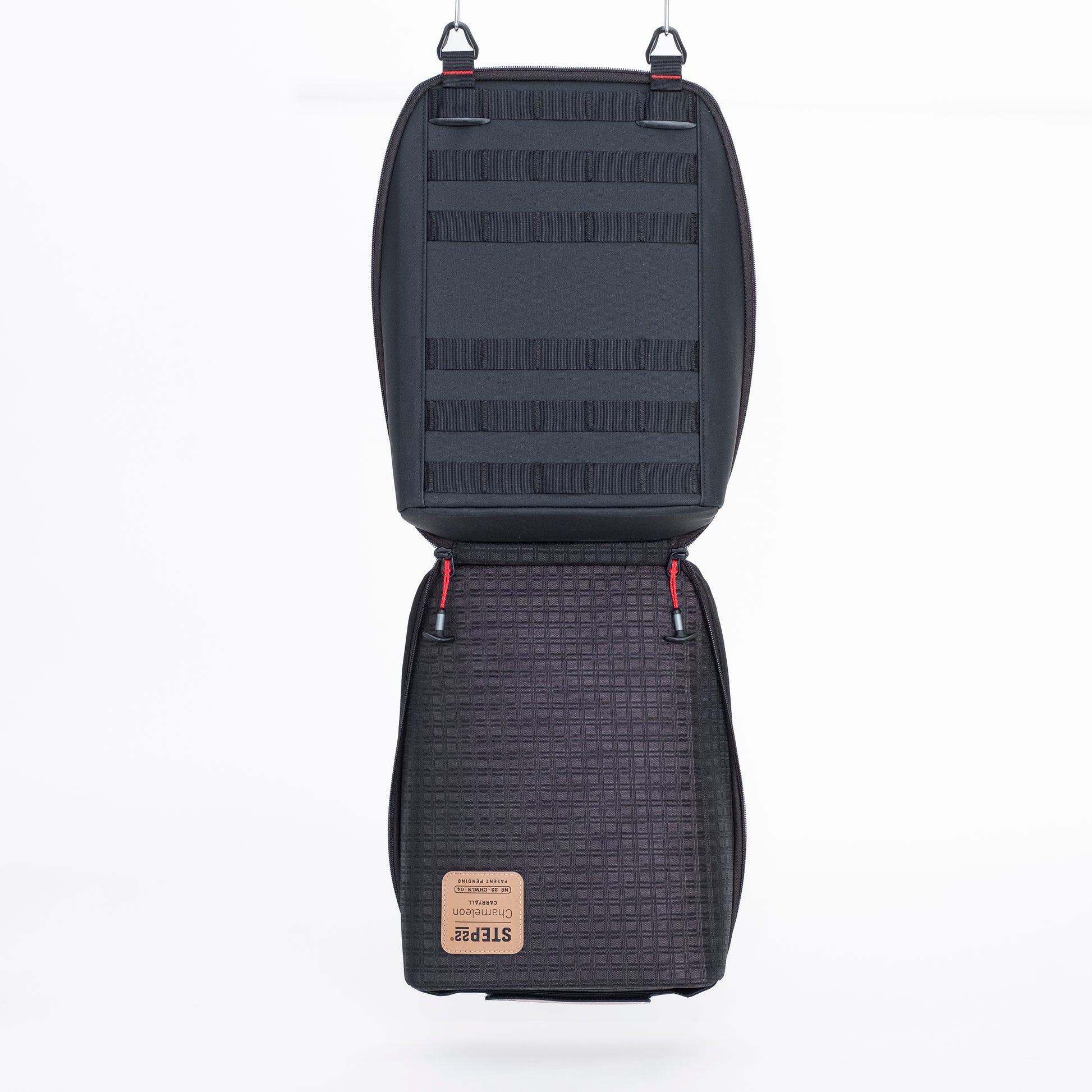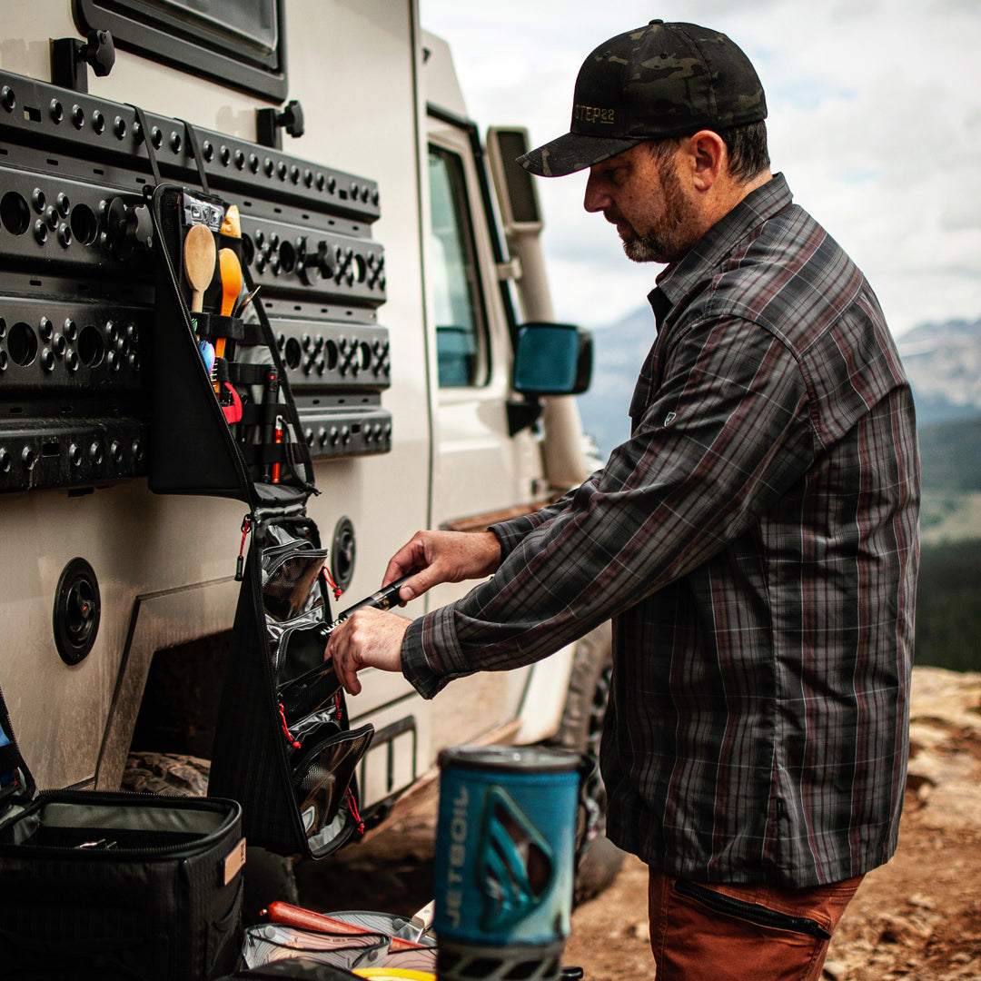 The Chameleon™ Carryall, made by STEP 22®, can be used for almost any travel/camping purpose, from a camp kitchen, personal drink bar, tech storage, medical supplies and more. Easily store and transport your goods, then setup your Chameleon™ quick and get back to your adventures. Chameleons™ are available with or without a REEF™ panel. The entire top loop section is hook compatible so you can attach your own hook backed accessories. The optional REEF™ panel is designed and purpose built to work perfectly in the top section and makes it easy to organize your utensils and gear.